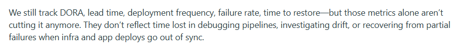 What it catches that the other four miss: Change failure rate tracks major incidents. Rework rate tracks the smaller problems that don’t set off alarms but still cost time. Quick patches, follow-up fixes, configs that needed another pass. They don’t look urgent, but they add up. And when AI pushes the pace of delivery up, this kind of low-grade churn becomes a major problem.