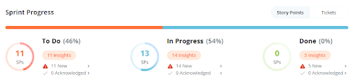 At a quick glance, you can view the number of tickets or story points in each status group: 'To Do', 'In Progress', and 'Done'.
