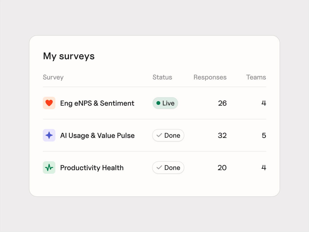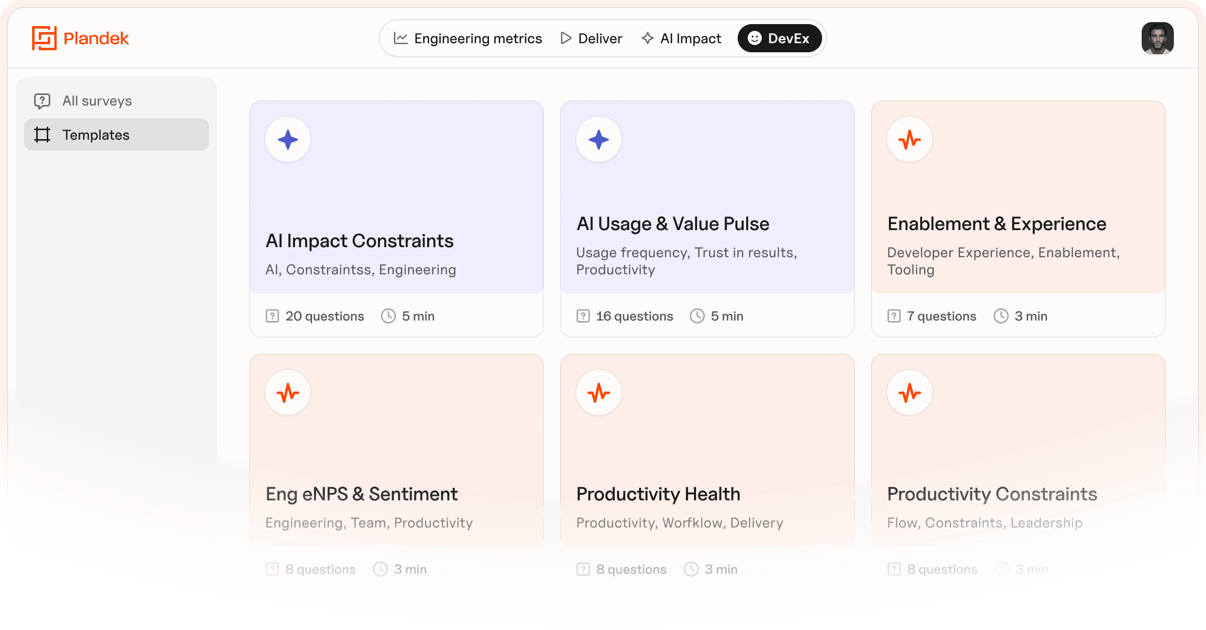 Plandek’s built-in survey tools help you measure engineering sentiment, engagement, and productivity constraints. Move beyond anecdotes and capture structured feedback on workflow friction, AI adoption and overall delivery health.