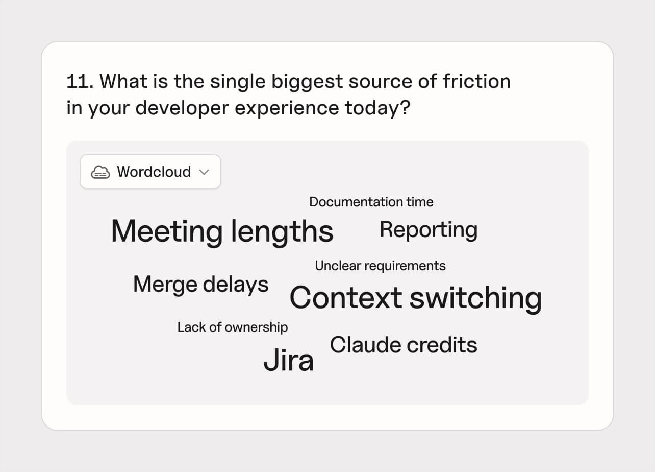 Quantitative survey data shows you what’s slowing you down, qualitative feedback shows you why. Together, they reveal the real sources of friction across your engineering teams - so you can take targeted action and drive meaningful improvement.