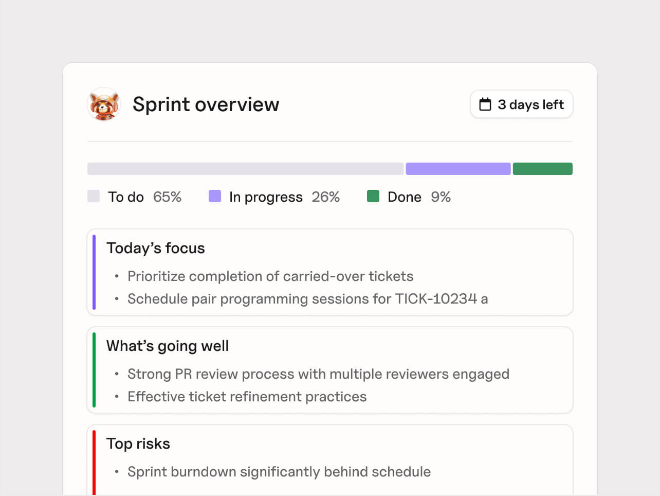 Dekka, Plandek’s AI engineering assistant, automatically surfaces blockers, prepares insights for ceremonies, and answers questions in real time. Engineers spend less time on admin and more time on meaningful work, reducing frustration and increasing engagement. Learn more