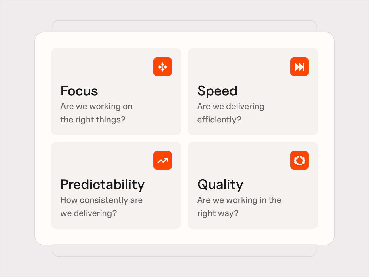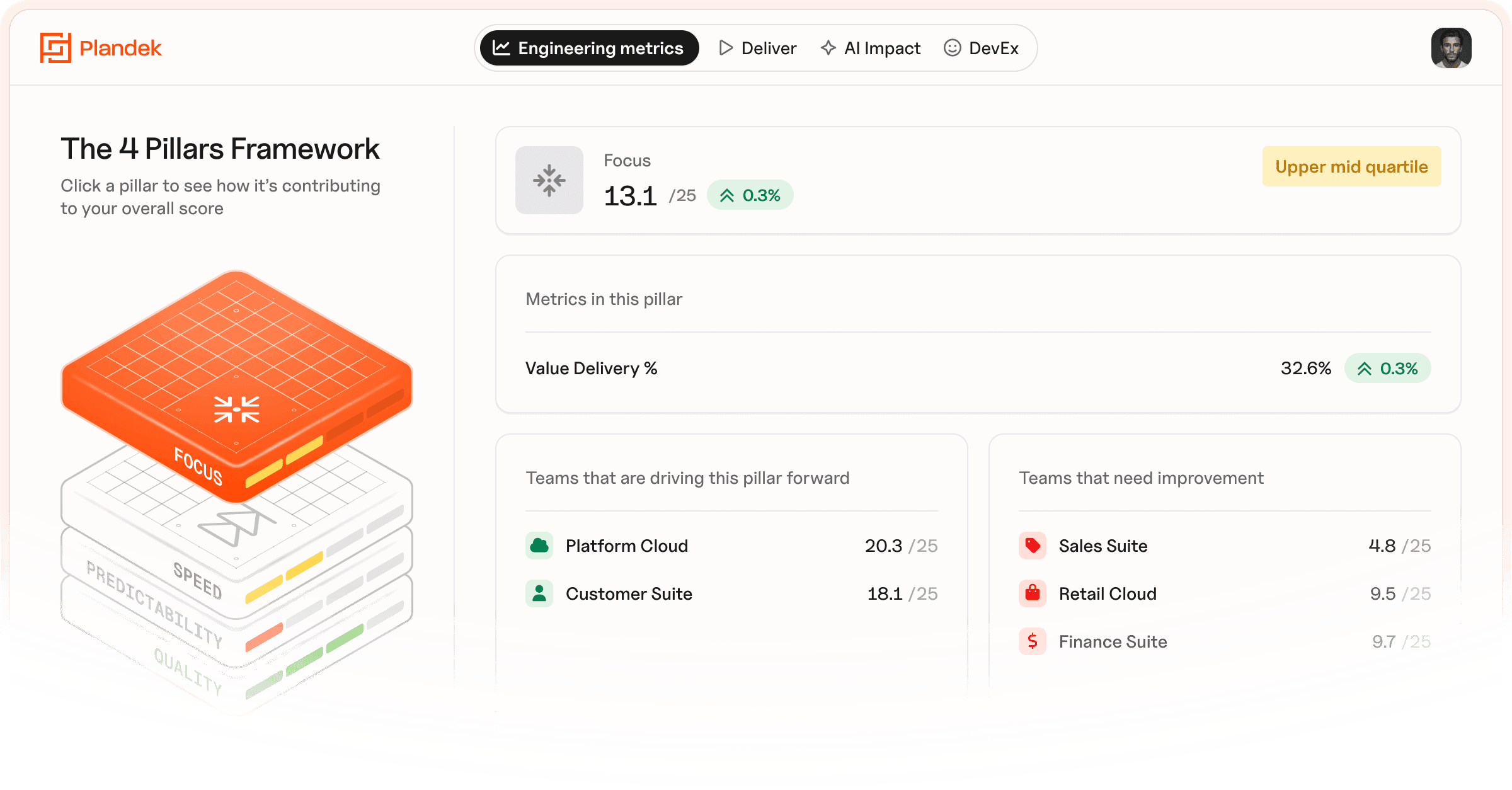 Plandek’s Four Pillars framework of metrics goes beyond DORA metrics by linking delivery speed to focus, predictability, and quality. It provides a structured method to improve productivity across the SDLC, aligning teams around meaningful KPIs that drive sustained performance.